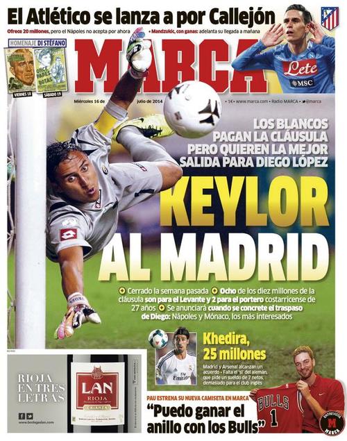 El Diario Marca de España anunció en su portada el fichaje del portero costarricense Keylor Navas por el Real Madrid.