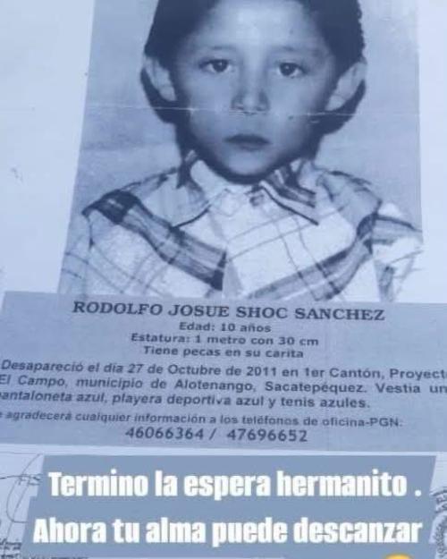 El Instituto Nacional de Ciencias Forenses (Inacif) confirmó que la osamenta hallada en marzo pasado en las faldas del volcán de Agua pertenece al menor Rodolfo Josué Shoc Sánchez desaparecido el 27 de octubre de 2011, cuando tenía apenas 10 años.