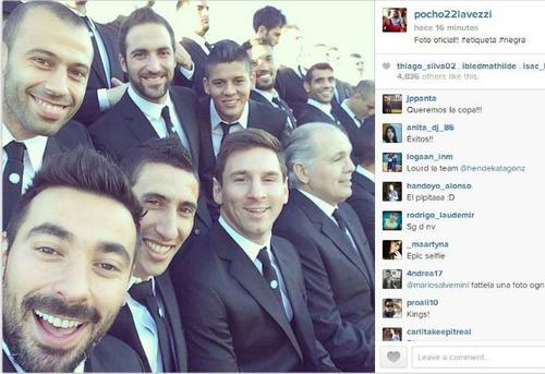 El plantel argentino se tomó la foto oficial, con todos vestidos con un impecable traje y Ezequiel Lavezzi aprovechó para entretenerse junto a Messi, Di María, Higuaín, Mascherano y Rojo y se tomó una "selfie".