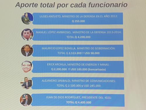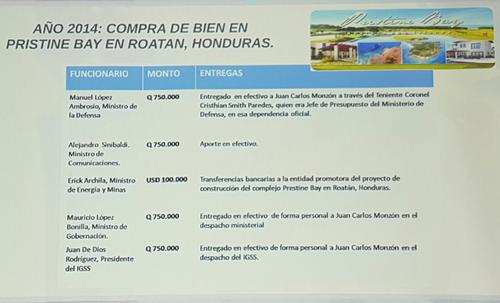 Por su parte, Mauricio López Bonilla, exministro de Gobernación aportó un total de 750 mil quetzales que entregó, personalmente en su despacho, a Juan Carlos Monzón. Erick Archila, Ministro de Energía y Minas, aportó 100 mil dólares a través de una transferencia bancaria directa al proyecto de construcción del complejo Prestine Bay en Roatán, Honduras.