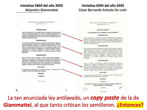 La similitud entre las citadas iniciativas fue evidenciada por el abogado Diego Sagastume Vidaurre, en su cuenta de X, donde también compartió algunos aspectos detectados al hacer la debida comparación.