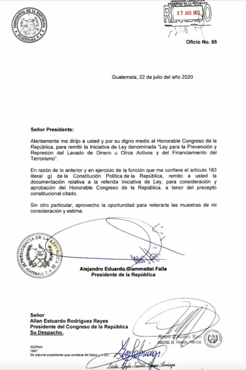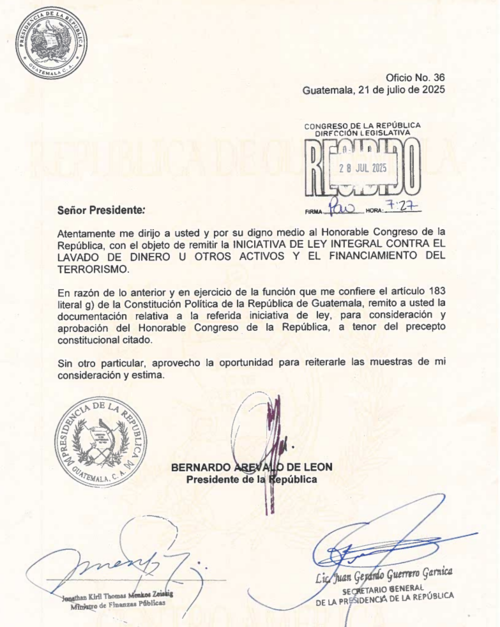De hecho, el nombre del último de estos textos es similar al que anunció Arévalo el pasado fin de semana, se denomina "ley para la prevención y represión del lavado de dinero u otros activos y del financiamiento del terrorismo".