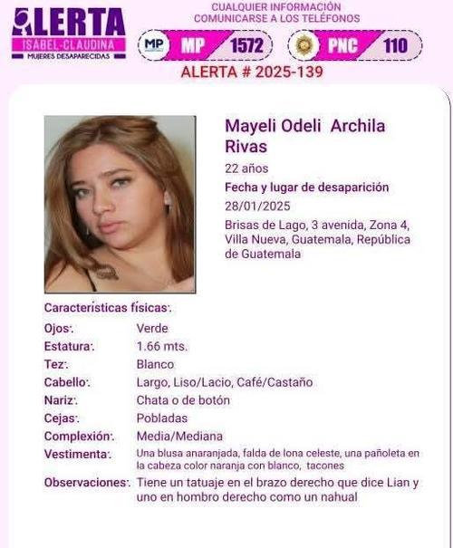La joven de 22 años fue vista por última vez el pasado 28 de enero, en Brisas de Lago, 3.ª avenida, zona 4 de Villa Nueva. Dos días después, una alerta Isabel-Claudina fue activada por su caso.
