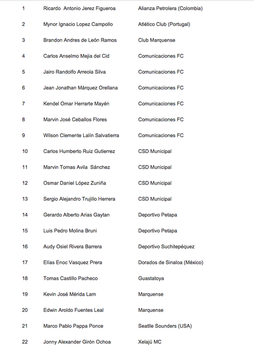 Entre las novedades del llamado, resaltan la convocatoria de tres futbolistas de líder Marquense, cuatro de Municipal y seis de Comunicaciones, además de cuatro legionarios. José Contreras, el habitual enganche de la sele, no fue llamado debido a la lesión.