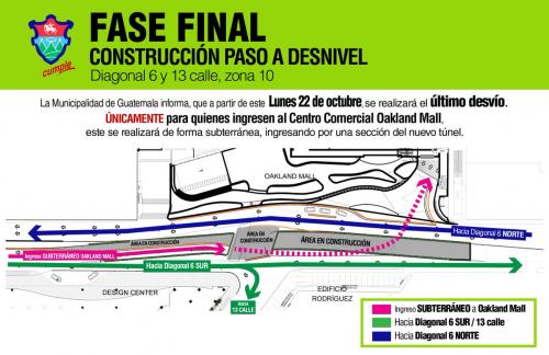 La construcción del nuevo paso a desnivel en la Diagonal 6 y 13 calle zona 10 frente al centro comercial Oakland Mall, está por concluir. Es por ello que los conductores que transitan por esa área deben tomar en cuenta el último desvío.