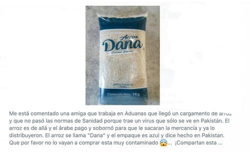 El texto compartido asegura: "Me está comentado una amiga que trabaja en aduanas que llegó un cargamento de arroz y que no pasó las normas de Sanidad porque trae un virus que sólo se ve en Pakistán. El arroz es de allá y el árabe pago y sobornó para que le sacaran la mercancía y ya lo distribuyeron".