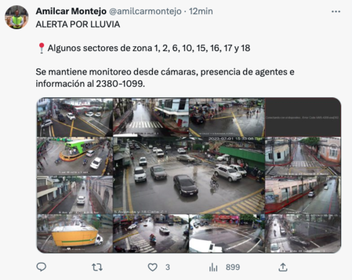 Algunos sectores de zona 1, 2, 6, 10, 15, 16, 17 y 18 muestran actividad lluviosa, conforme se observa en las cámaras de monitoreo de la Policía Municipal de Tránsito (PMT). El a viso se hace para evitar que ocurran accidente ya que los neumáticos pueden perder fricción con el asfalto mojado.