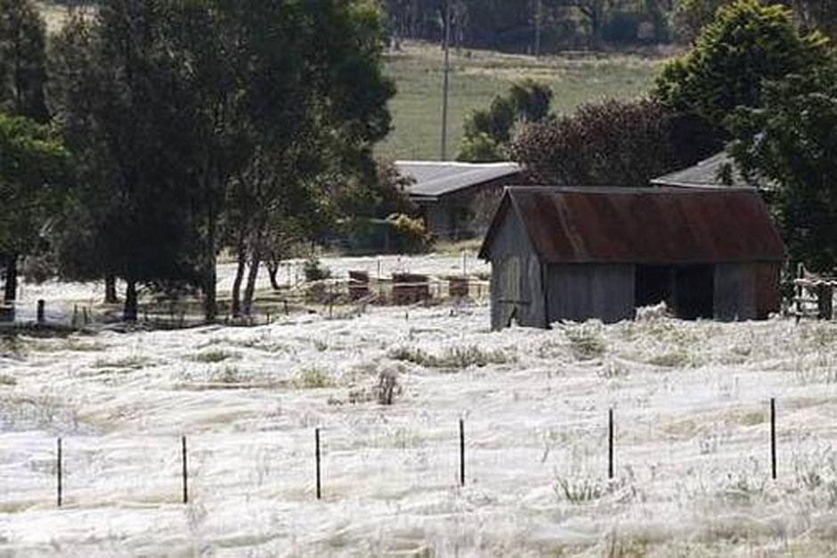 Los arácnidos han tejido miles de "mantas" blancas alrededor de los campos en Goulburn, como si fuese una película de terror no apta para aracnofóbicos.