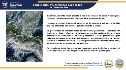 De acuerdo con el Insivumeh, los nublados y lloviznas podrían presentarse también al amanecer, este lunes 17 de febrero, principalmente en la zona norte del país.
