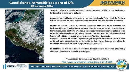 El Instituto Nacional de Sismología, Vulcanologia, Meteorologia e Hidrología (Insivumeh) publicó este lunes 1 de enero de 2024, las condiciones atmosféricas para la primera semana del año.