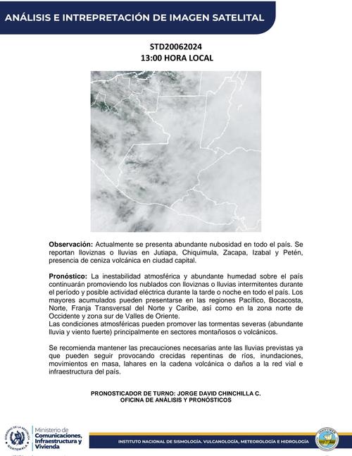 Para la noche de este jueves 20 de junio, el Instituto Nacional de Sismología, Vulcanología, Meteorología e Hidrología (Insivumeh) informó que la presencia de abundante nubosidad seguirá predominando en el territorio nacional.