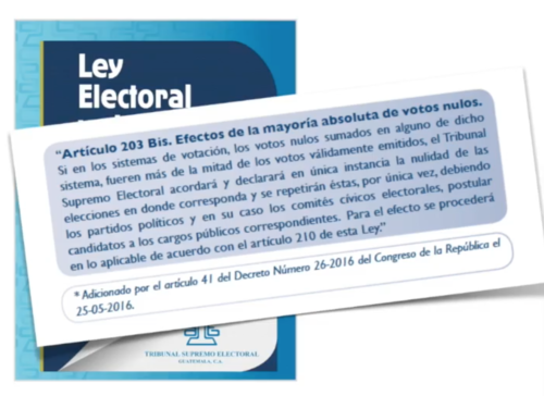 Durante el proceso electoral de 2019, por primera vez, el voto nulo tuvo vinculación en Guatemala. Según la normativa, si la mitad más uno de los votos válidamente emitidos son nulos, las Elecciones se tienen que repetir.