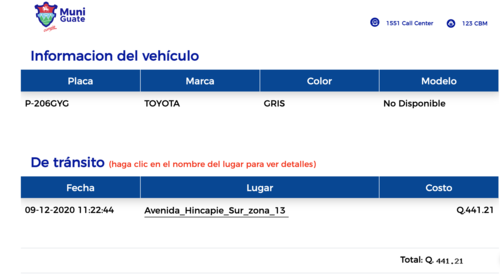 La primera de las sanciones corresponde al 09 de diciembre de 2020, en la Avenida Hincapié Sur, en la zona 13 de la Ciudad de Guatemala, por no cumplir con los límites de velocidad y es por un monto de Q441.21, indica el portal de la Municipalidad de Guatemala.