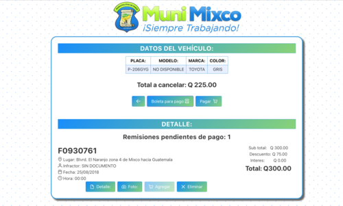 Por aparte, a esa misma placa le aparece una multa en el bulevar El Naranjo, zona 4 de Mixco hacia la Ciudad de Guatemala, sin detallar que infracción cometió. La misma fue impuesta el 25 de agosto de 2018, por un monto de Q225, que hasta la fecha no ha sido pagada.