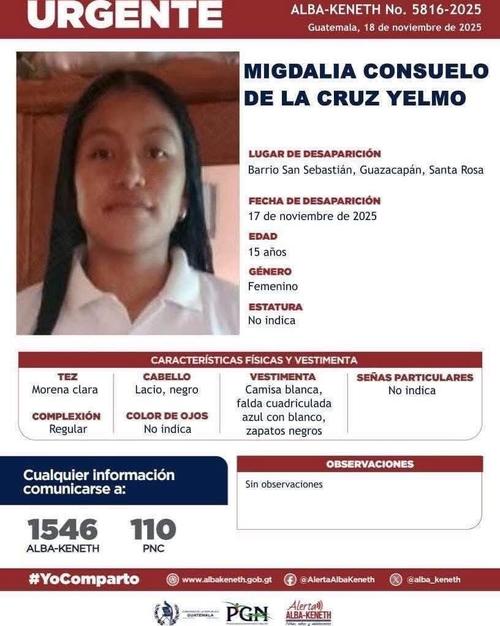 Migdalia Consuelo de la Cruz, de 15 años, desapareció el pasado 17 de noviembre en el Barrio San Sebastián, Guazacapán, Santa Rosa, luego de salir de clases.