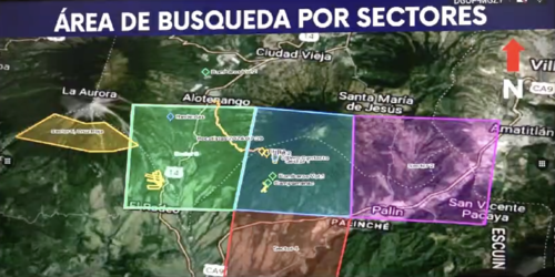 La búsqueda de la aeronave se ha delimitado a cinco áreas, pero, por el momento, la principal es el volcán de Agua. Además, sectores como: San Vicente Pacaya, Santa María de Jesús y hasta el ingenio Concepción, en el departamento de Escuintla.
