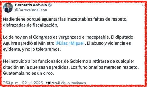 Sin embargo, el hecho no pasó desapercibido, y el mismo presidente Bernardo Arévalo se pronunció al respecto. "Nadie tiene porqué (sic) aguantar las inaceptables faltas de respeto, disfrazadas de fiscalización", escribió en su cuenta de X.