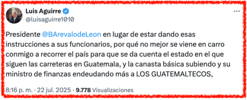 "En lugar de estar dando esas instrucciones a sus funcionarios, por qué no mejor se viene en carro conmigo a recorrer el país para que se dé cuenta el estado en el que siguen las carreteras en Guatemala", dice un mensaje dirigido a Arévalo.