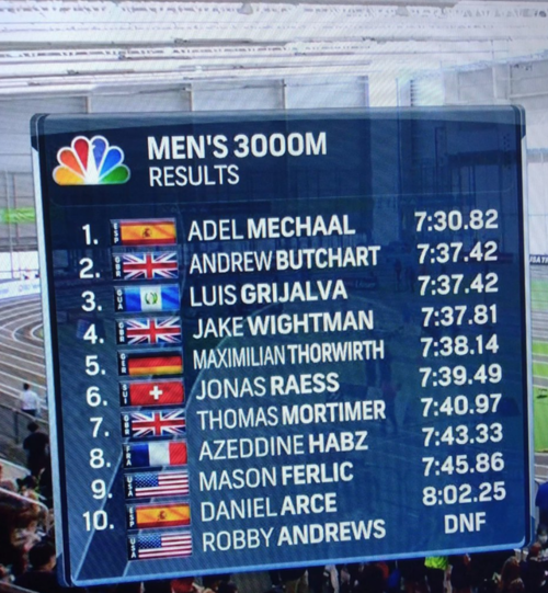 Very quick men's 3000m in Staten Island. Spain's Adel Mechaal breaks Sergio Sanchez's European record by running 7:30.82 for the win. Two pbs in nine days for Luis Grijalva. Top 9 all run indoor pbs. https://t.co/7S0yGYiZOG pic.twitter.com/9xuvoiH38z