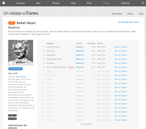 La cantante Madonna adelantó a través de su página de internet y diversas redes sociales seis de los temas que incluirá en su nuevo álbum, titulado "Rebel Heart", que será publicado en la primera semana de marzo de 2015.