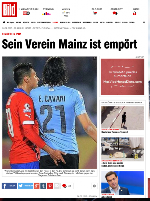 El ofensivo gesto de Gonzalo Jara a Edinson Cavani, en el partido Chile-Uruguay, le puede costar caro al defensa chileno. Su club en la Bundesliga, el Mainz, está dispuesto a rescindir el contrato que mantiene con el jugador.