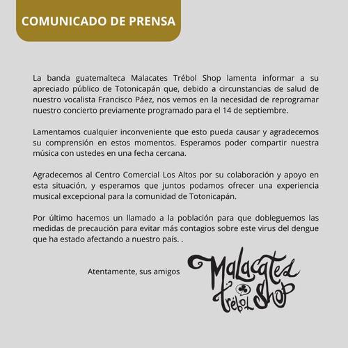 A través de redes sociales, la agrupación guatemalteca Malacates Trébol Shop anunció la suspensión de un concierto que tenía programado para este 14 de septiembre en Totonicapán.