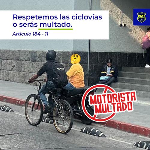 De acuerdo con el artículo 184 - 11 de la Ley de Tránsito en Guatemala y su reglamento, por utilizar carriles especiales diseñados para la circulación de otro medio de transporte se aplicará multa.