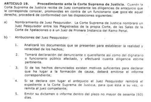 Según el artículo 14 de la Ley en Materia de Antejuicio, en este caso, corresponde a la CSJ analizar el expediente y desarrollar las diligencias pertinentes para determinar si se retira el derecho de antejuicio a los presuntos implicados en el caso.