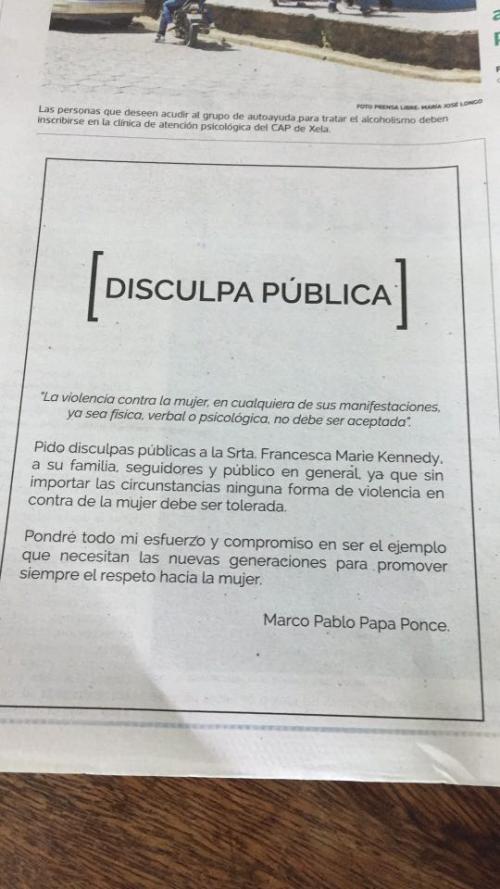 La disculpa pública de Pappa empieza con una frase: “La violencia contra la mujer, en cualquiera de sus manifestaciones ya sea física, verbal o psicológica no debe ser aceptada”. Luego, agrega que la disculpa también es para la familia de Kennedy, sus seguidores y el público en general.