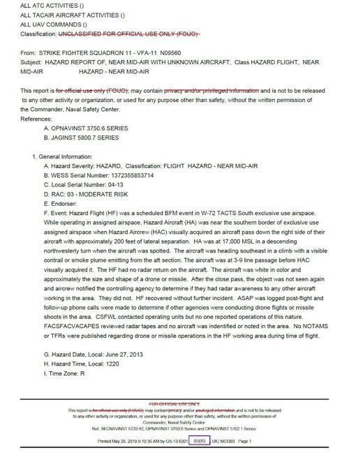 El informe más antiguo es del 27 de junio del 2013, y da cuenta del encuentro entre un F/A-18F Super Hornet del Escuadrón de Cazas de Ataque 11 y un "avión de color blanco y aproximadamente del tamaño y la forma de un dron o misil”.