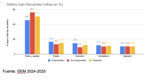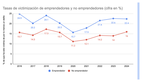Los datos recopilados por la encuesta del GEM revelan que la delincuencia afecta de manera desproporcionada a quienes se atreven a crear empresas. Según la información recopilada con la encuesta del GEM (APS), para 2024, un 18.3% de la población fue víctima de al menos un delito en los últimos 12 meses.
