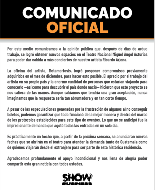 "Después de días de intenso trabajo, logramos abrir nuevos espacios en el Teatro Nacional para que más personas puedan vivir la experiencia de "Lo que el Seco no dijo" con Ricardo Arjona", se lee en un comunicado.