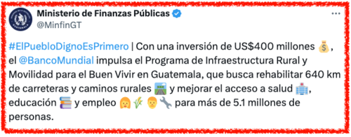 - 400 millones de dólares (Q3,060 millones), para rehabilitar 640 kilómetros de carreteras y caminos rurales, otorgado por el Banco Mundial.
