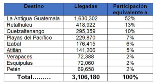 Le sigue el departamento de Retalhuleu con 418,922 visitas; Quetzaltenango con 295,359; playas del Pacífico con 229,870; Izabal con 176,415; Atitlán con 141,206; Esquipulas con 72,060 y Petén con 69,658; para un total de 3,106,180.