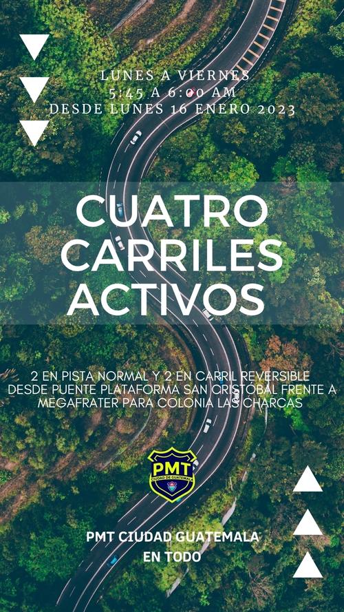 De 5:45 a 6:00 de la mañana se utilizarán las dos pistas, cuatro carriles, para ingresar a la ciudad de Guatemala desde el puente de San Cristóbal frente a la Mega Frater, explicó Amílcar Montejo, de la PMT de la ciudad de Guatemala.