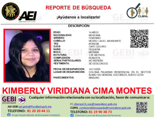 Kimberly Viridiana Cima Montes, de 14 años, desapareció el 14 de noviembre en la colonia Palmiras, Escobedo, México.
