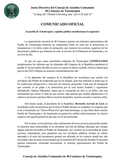 Un contundente mensaje enviaron los líderes indígenas de los 48 Cantones de Totonicapán a los 87 diputados que el pasado 26 de noviembre se aumentaron el sueldo y se recetaron una indemnización al finalizar su período.