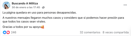 "La página quedará en uso para personas desaparecidas. A nuestros mensajes llegaron muchos casos y considero que sí podemos hacer presión para que todos los casos sean virales", se lee.