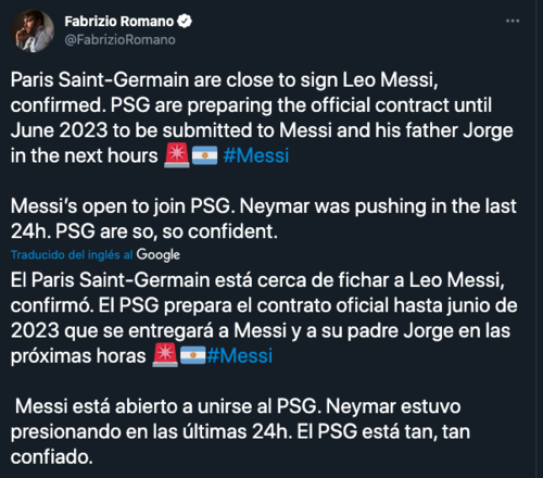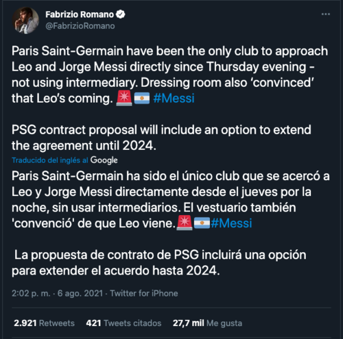 "El PSG ha sido el único club en acercarse a Leo y Jorge Messi... El vestuario está convencido de que Leo viene", publicó el periodista.