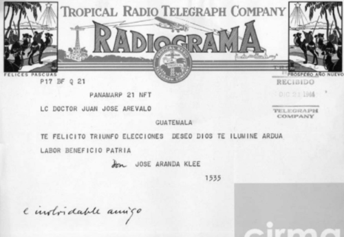 "En diciembre de 1944 mi abuelo le envió un telegrama a Juan José Arévalo felicitándolo por su triunfo en las elecciones. Este es el telegrama original encontrado en los archivos del CIRMA Guatemala, 80 años después felicito a Bernardo Arévalo", contó.