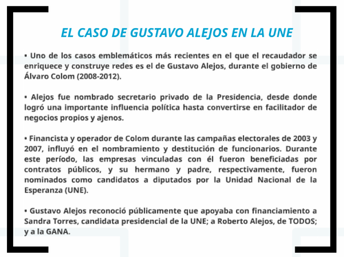 En el informe, también se especifica que Alejos fue financista del partido Unidad Nacional de la Esperanza (UNE) durante las campañas electorales de 2003 y 2007.