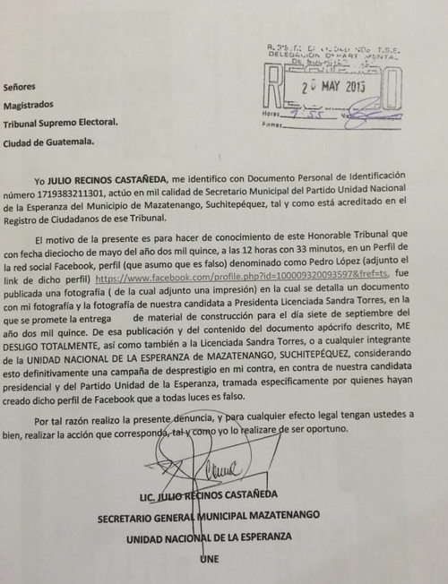 El vocero de Lider explicó que su partido no ha autorizado ninguna impresión de volantes y que esto puede tratarse de una campaña negra en su contra. La UNE alega ante el Tribunal Supremo Electoral (TSE) con los mismos argumentos.