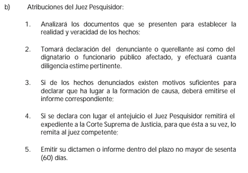 Al recibir la solicitud de antejuicio, la CSJ tendrá que nombrar a un juez pesquisidor, que puede ser un magistrado de la misma CSJ, de las Salas de Apelaciones o un juez de primera instancia del ramo penal, que tendrá como máximo 60 días para decidir si se le retira o no la inmunidad a Baldizón.