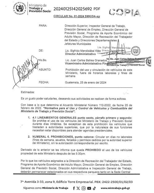 En este sentido, la cartera de Trabajo, en su circular No 01-2024 SMK/DA-sp, prohíbe a los empleados utilizar los vehículos asignados a la cartera después de las 17:30 horas de días hábiles. Además, tampoco podrán utilizarse los mismos durante los fines de semana.