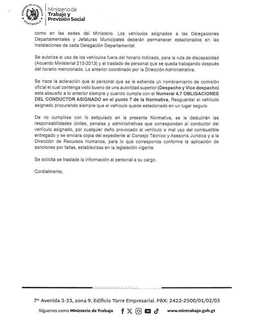 "Por lo que los vehículos asignados a la Dirección de Recreación del Trabajador del Estado, Programa de Aporte Económico del Adulto Mayor, Dirección General de Empleo, Dirección General de Previsión Social, Dirección Administrativa e Inspección General de Trabajo; deberán permanecer estacionados en sus respectivos parqueos tanto en la Sede Central, como en las sedes del Ministerio", se lee en el documento.