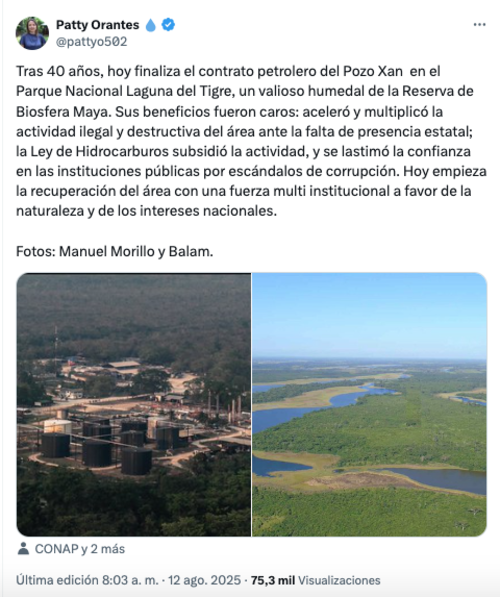 El pasado 12 de agosto, fecha en que terminó el contrato de exploración y explotación petrolera de Perenco en Petén, Orantes hizo varias publicaciones en las redes sociales, refiriéndose a presuntos daños ambientales detectados en la Laguna del Tigre.