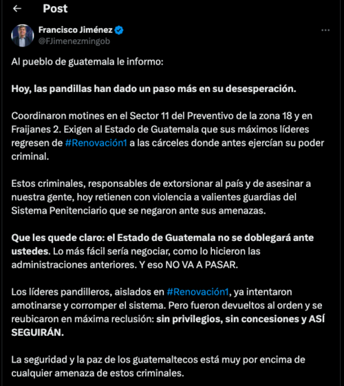 Jiménez enfatizó que el Gobierno de Guatemala no negociará ni cederá ante estas presiones, a diferencia de administraciones anteriores que optaron por el diálogo con estas estructuras criminales.