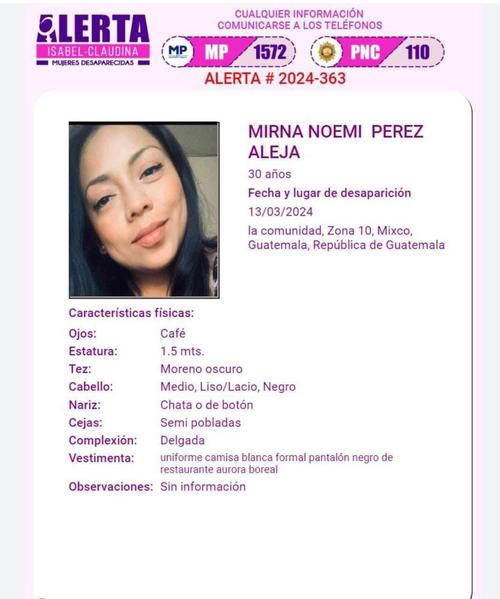 El pasado 13 de marzo fue vista por última vez Mirna Noemí Perez Aleja, una mujer de 30 años, que supuestamente desapareció en la Comunidad, zona 10 de Mixco.