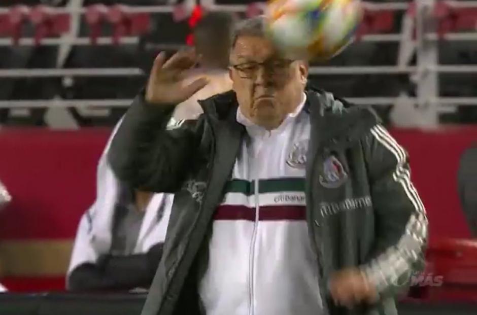 El golpe involuntario hizo trastabillar a Martino quien pronto recibió las disculpas de su colega. El pelotazo causó una herida en el técnico de México que requirió atención para controlar el sangrado.