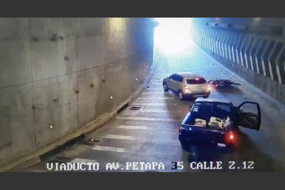 Esto tras colisionar su moto contra un paredón del viaducto ubicado en la 35 calle, bajo la avenida Petapa. En las imágenes se observa que la moto se desliza en el asfalto.
